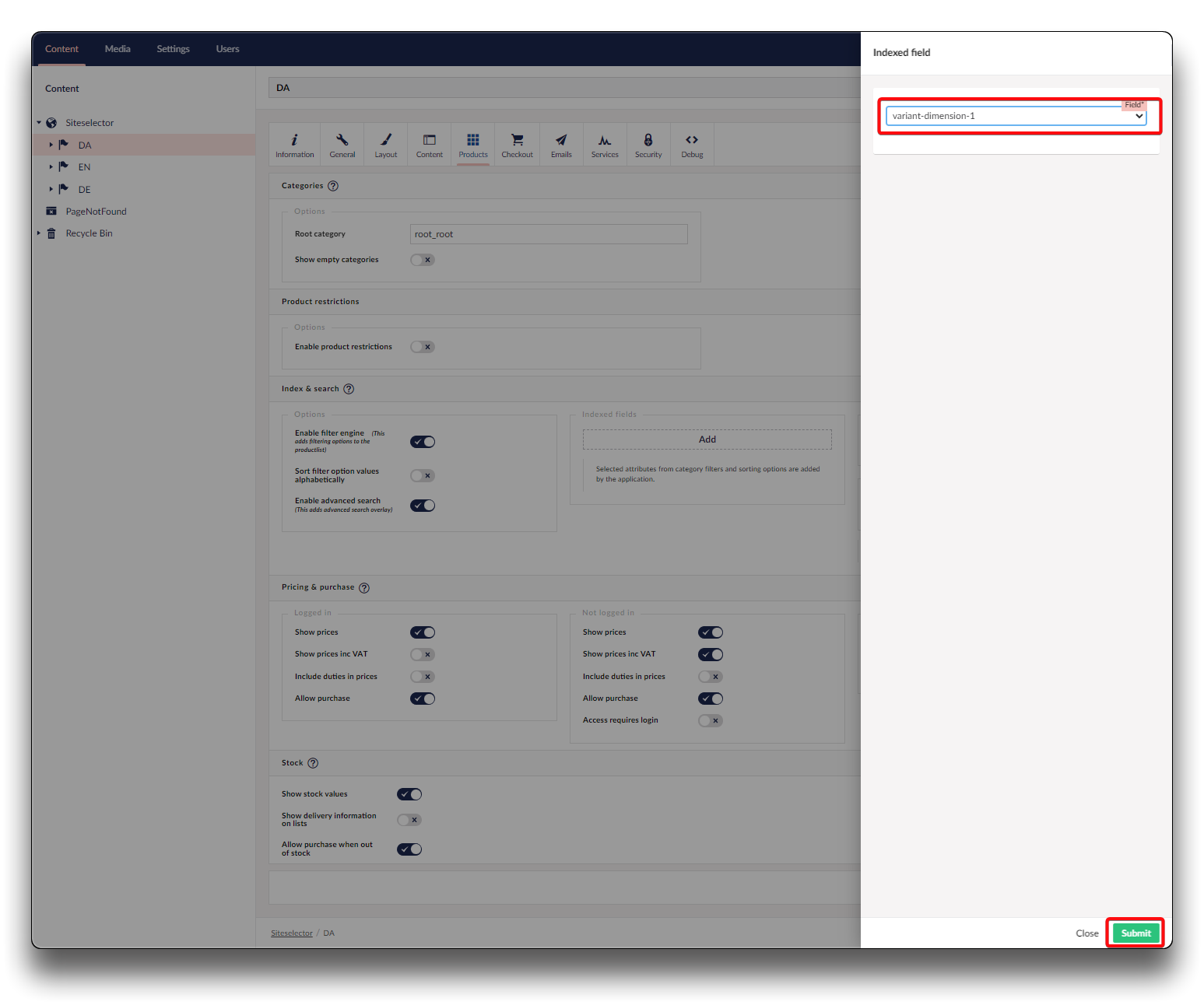Click "Add" and choose the attribute to be used for indexing the products. Click "Submit"