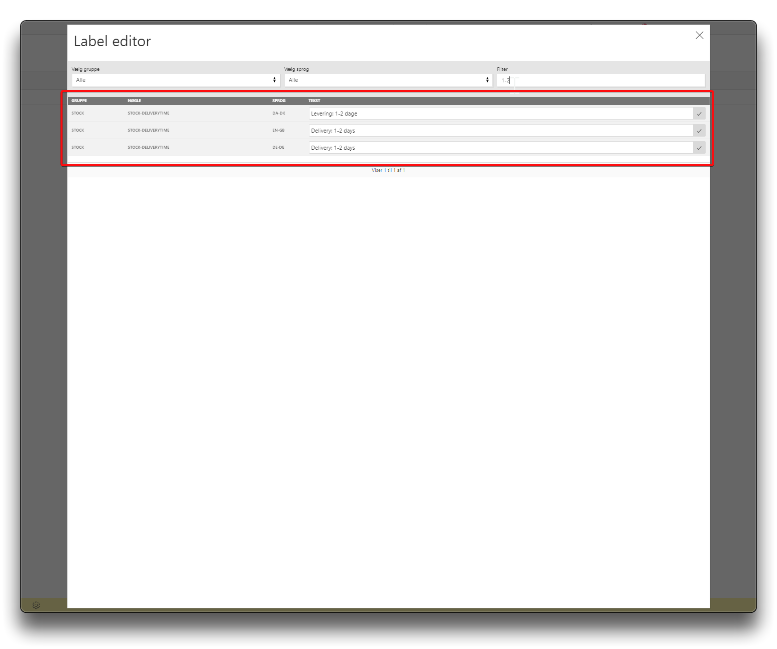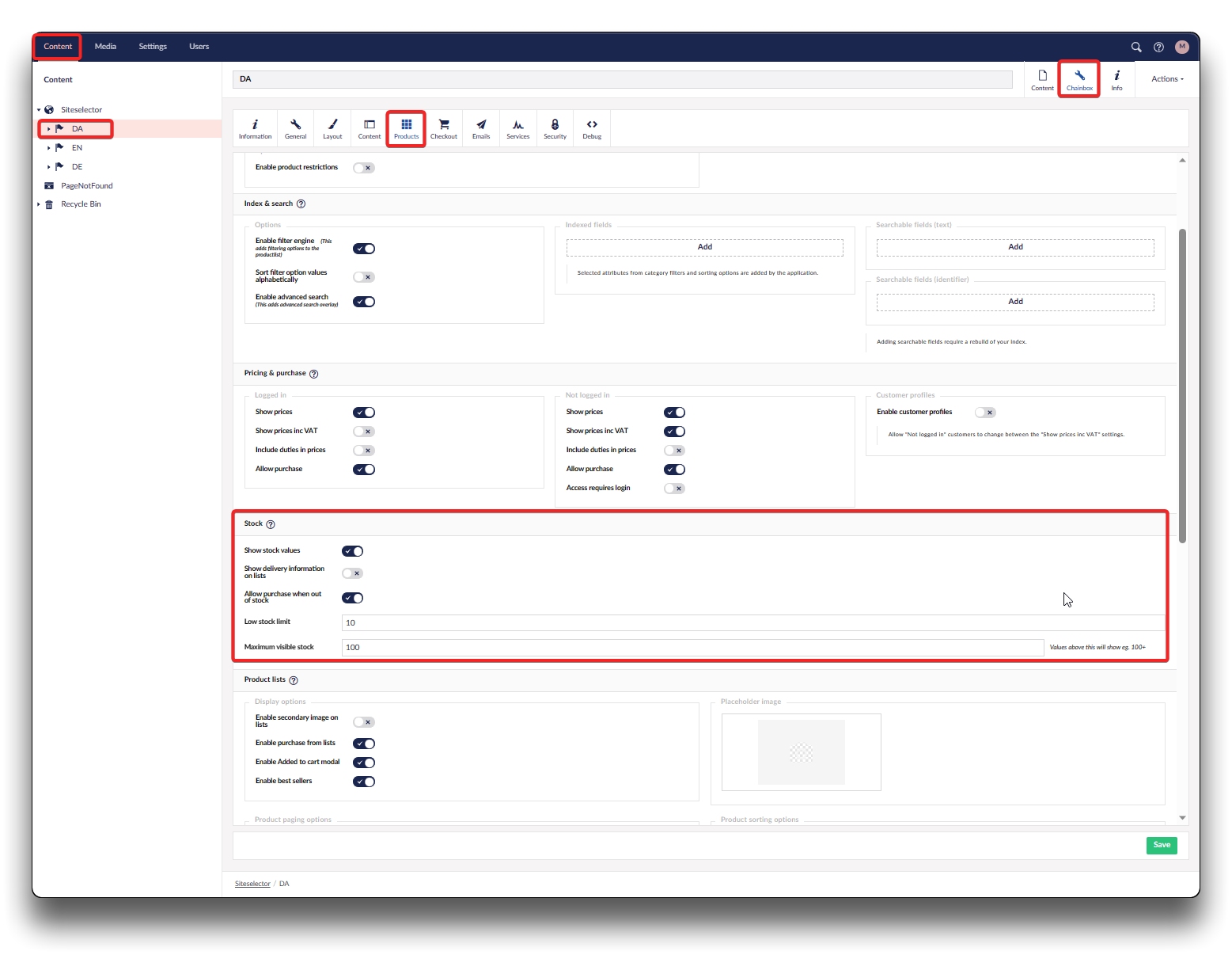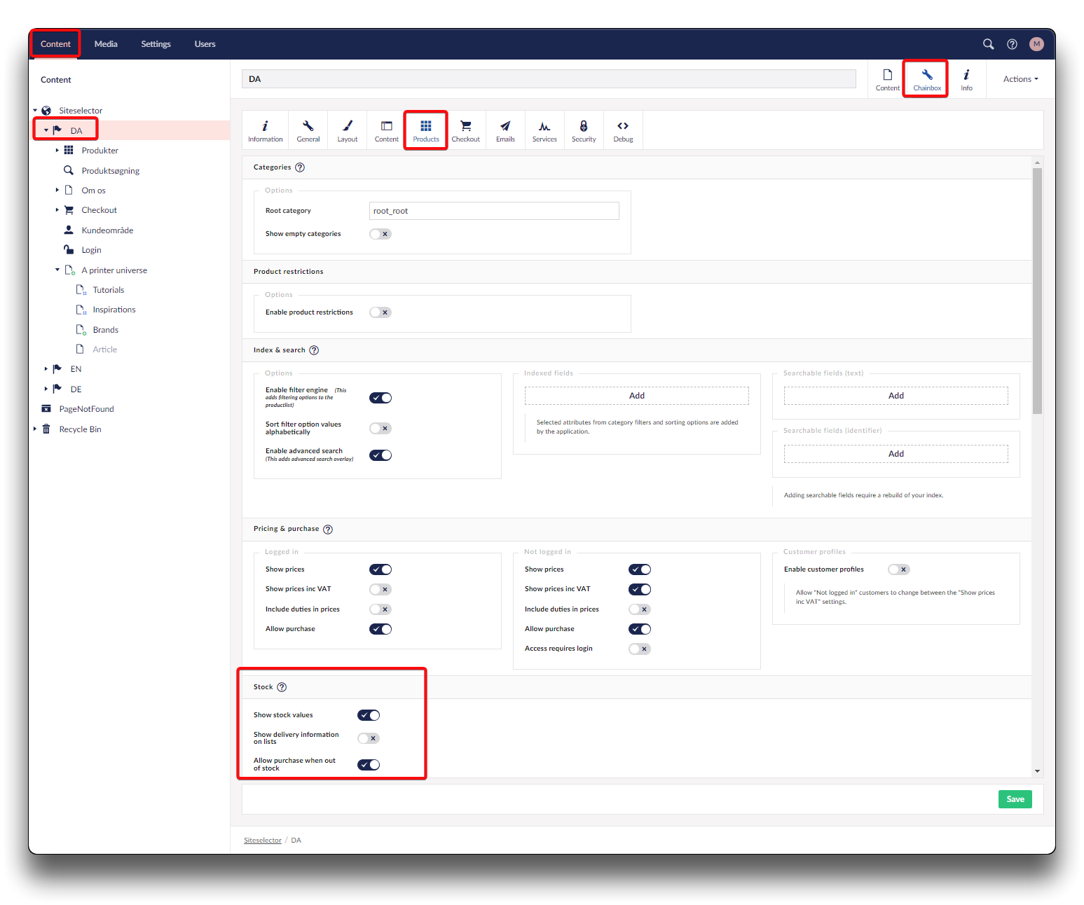 Example of activation of "Show stock values" and "Show delivery information on lists" on webshop