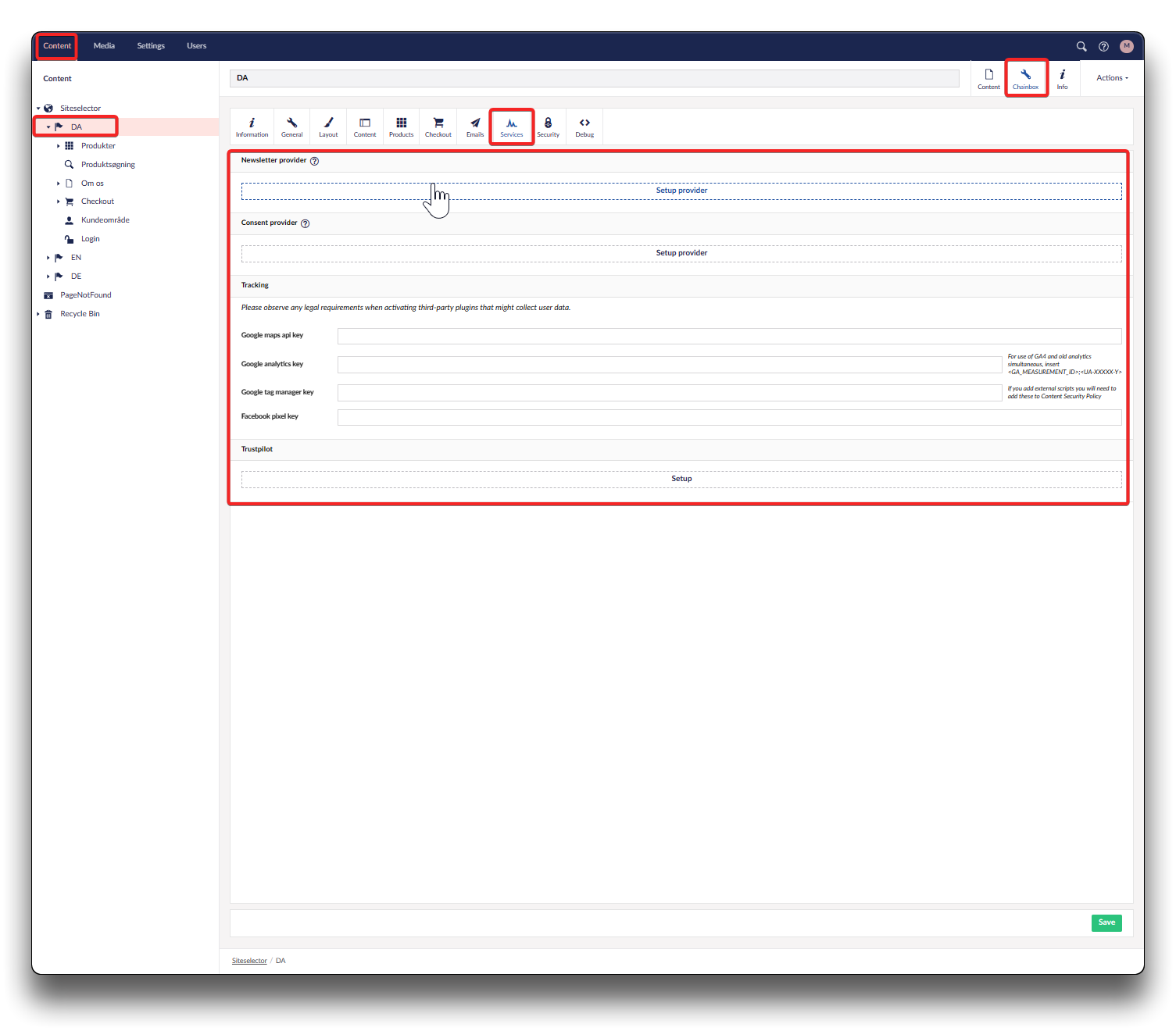Services The Service section offers a range of options to set up integrations with various providers, including Newsletter providers, Trustpilot, and tracking services. How to navigate to Services section Previous Email templates Next Newsletter provider setup