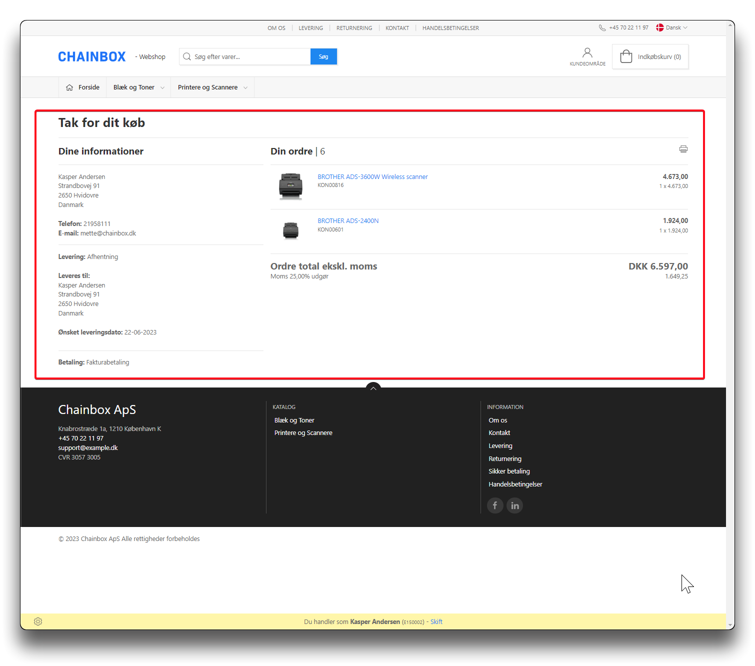 Order confirmation The layout of the Order confirmation-page is set and cannot be modified directly. If you require any changes to the layout, it will require development by Chainbox. Order confirmation on webshop Order confirmation page in Umbraco Previous Payment Next Email receipt