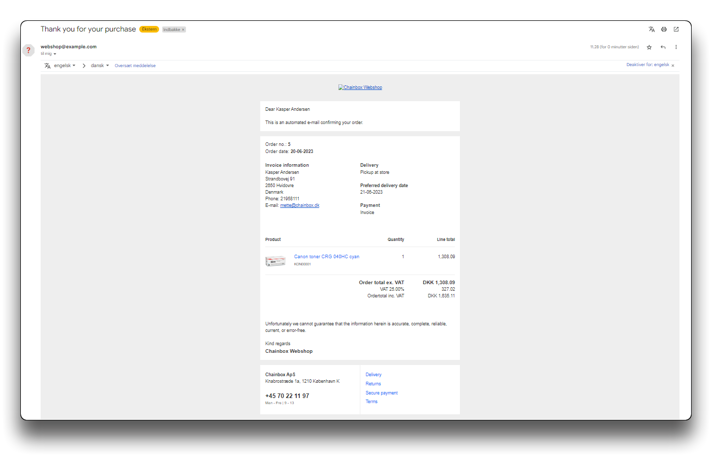 Email receipt Example of order confirmation sent from the webshop. Please refer to below link for options to customize. emails Email confirmation from webshop Previous Order confirmation Next Content & landingpages